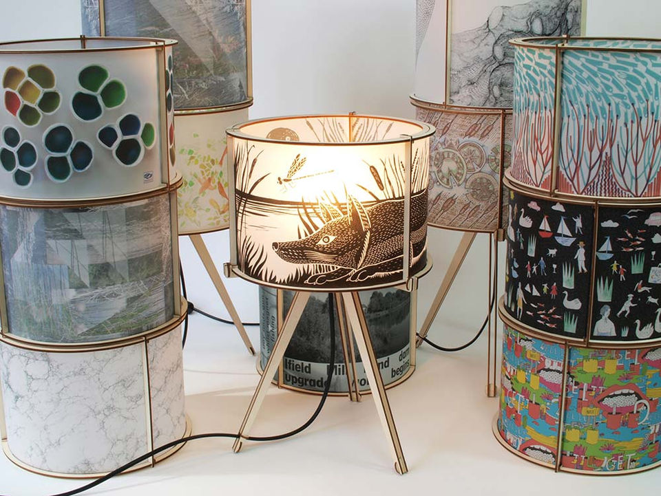 The collection included floor-standing, pendant and table lamps, stools and nesting tables. The Laser Lamp was the smallest piece from the Pond Life collection. A collaboration with artists, illustrators and designers based around the UK. Several original artworks based on the theme ‘Pond Life’ were created and printed on the lampshades.